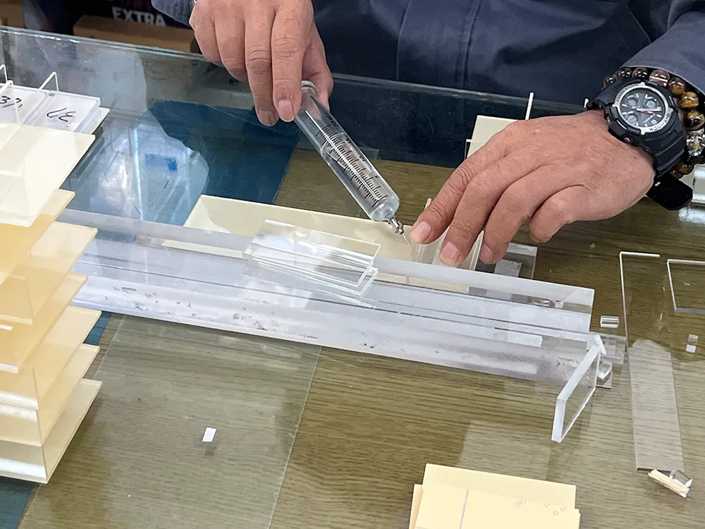 またガラスに比べて比重が軽いので、ケース、什器を製作する上で安全に展示が出来る事です。