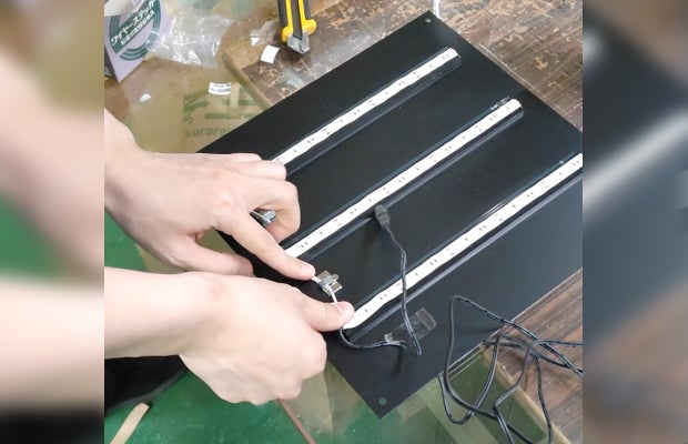 LEDテープが剥がれないようにグルーガンでしっかりと接着していきます。
