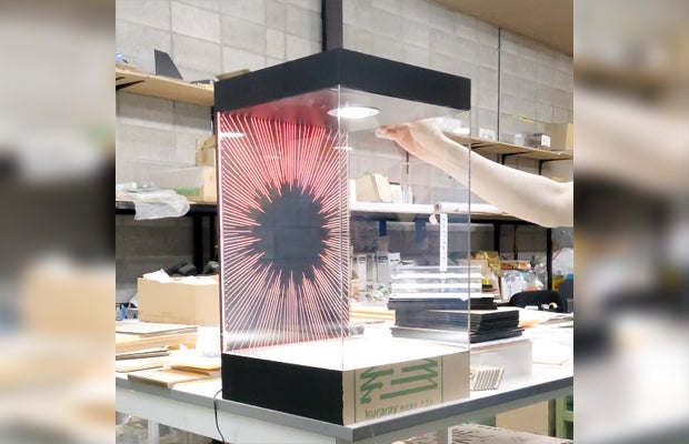 材料となるアクリル材を各パーツに切り分ける際には加工機を使用しますが、それ以外の組み立てから梱包に至るまで、全て人の手によって丁寧に行われています。